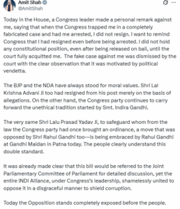 शाह ने कथित तौर पर उन्हें मनगढ़ंत मामले में फंसाने के लिए कांग्रेस की आलोचना करते हुए कहा कि गिरफ्तारी से पहले उनका इस्तीफा और बाद में बरी कर दिया जाना दिखाता है कि नए विधेयकों का उद्देश्य नैतिक जवाबदेही को लागू करना है।