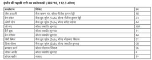 भारतीय टीम की पहली पारी में सलामी बल्लेबाज यशस्वी जायसवाल (13 रन) कुछ खास नहीं कर पाए और दूसरे ओवर में जोफ्रा आर्चर का शिकार बने. करुण नायर ने भी सेट होने के बाद अपना विकेट गंवाया. करुण ने 62 बॉल पर 40 रन बनाए, जिसमें चार चौके शामिल रहे. वहीं कप्तान शुभमन गिल 16 रन बनाकर क्रिस वोक्स की गेंद पर आउट हुए. इसके बाद केएल राहुल और पंत के बीच शतकीय साझेदारी हुई. लेकिन तीसरे दिन लंच ब्रेक से ठीक पहले पंत रन आउट हो गए. इसके बाद केएल राहुल ने शतक लगाया लेकिन वो 100 रन बनाकर आउट हो गए. इसके बाद जडेजा ने 72 रनों की पारी खेली और भारतीय टीम 387 के स्कोर पर सिमट गई।