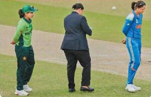 टॉस के दौरान मैच रेफरी की गलती और पाकिस्तान की कप्तान फातिमा सना की बेइमानी सामने आई। दरअसल, मैच रेफरी शांद्रे फ्रिट्ज और टॉस प्रेंजेटर मेल जोंस ने पाक कप्तान फातिमा सना से टॉस के लिए कॉल किया, जिन्होंने टेल्स कहा। लेकिन टॉस हेड्स आया और मैच रेफरी ने सना को टॉस का विजेता घोषित कर दिया, लेकिन यहां पाक कप्तान ने बेईमानी कर दी और तुरंत गेंदबाजी करने का फैसला कर लिया, जबकि उन्हें ईमानदारी बरतते हुए मैच रेफरी से कहना चाहिए था कि मैंने हेड्स नहीं टेल्स कहा था और भारतीय कप्तान ने टॉस जीता है, लेकिन उन्होंने ऐसा नहीं किया।